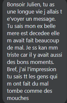 merci Julien Terreau jai ecoute cette roqya en deux fois cette nuit. premiere partie au bout de 2h30 ecoute , sortie du haut du corps vers les pieds une sensation que une partie du corps part... ensuite une boule taille d une grosse bille qui parcourt le corps vite remonte vers la tête et sort aussi. Ensuite écrasement du ventre comme si qq chose se roulait en boule dedans et essaie de sortir par les jambes puis pieds. Pour finir je sens une tête de djinn ou espèce sortir entre mes jambes comme si j accouchais c c'etait impressionnant ses mains touchaient les miennes comme pour m aider a sortir ...impressionnant tellement puissante que les autres écoutées....que dire je pense que al hamdoulillah j ai senti.quelque chose s extirper de ma tête vers les pieds c etait impressionnant au bout de 2h20 d ecooute....💛💜🧡💙❤💚
