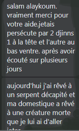 l'interprétation du rêve est une part de la prophétie il ya une partie du reve qui est du domaine de la révélation , et peu hélas comprenent leur symbolisme j'ai développé une approche des rêves en me concentrant sur la provocation de ceux ci en effet en me servant de certaines rokia après des années d'observation je me suis apperçu que les memes rêves revenez automatiquement , ce qui m'a permis d'en saisir par l'aide d'Allah le sens esoteric qui m'a permis d'apporter des réponses a de nombreuses personnes ,cela représente une grande aide dans les processus de guérison et ce qui m'a amené à la conclusion que tout ce qui vous affectent dans le monde astral du reve se répercute dans le monde reel et inversement comme la magie arrive d'abord en rêve pour se répercuter dans la vie des gens atteint de mal occulte Après tout diagnostique dormez avec cette rokia sera indispensable pour nous éclairer sur qui vous a fait la magie et a quel endroit et comment avec quel objet un bijoux un plat ou un vêtement ....cette stratégie couplée avec le diagnostic et déblocage est très efficace pour détruire tout le travail malfaisant de ces maudits sorcier bonne écoute , si votre cas nécessite de désactiver les attaques et d'en diminuer les intensités dormez alors avec Ayat El Kursi tant que vous n'avez pas obtenue la tranquillité tant recherché , si malgré l'écoute de Ayat El Kursi vous êtes attaqués alors cest qu'il ya de la magie dans votre maison regardez en priorité votre literie et surveillez les vêtement qui vous affaiblissent de toute façon vous verrez en reve ou se trouve la magie ....ET DORMEZ avec la seconde rokia Brulure djinn